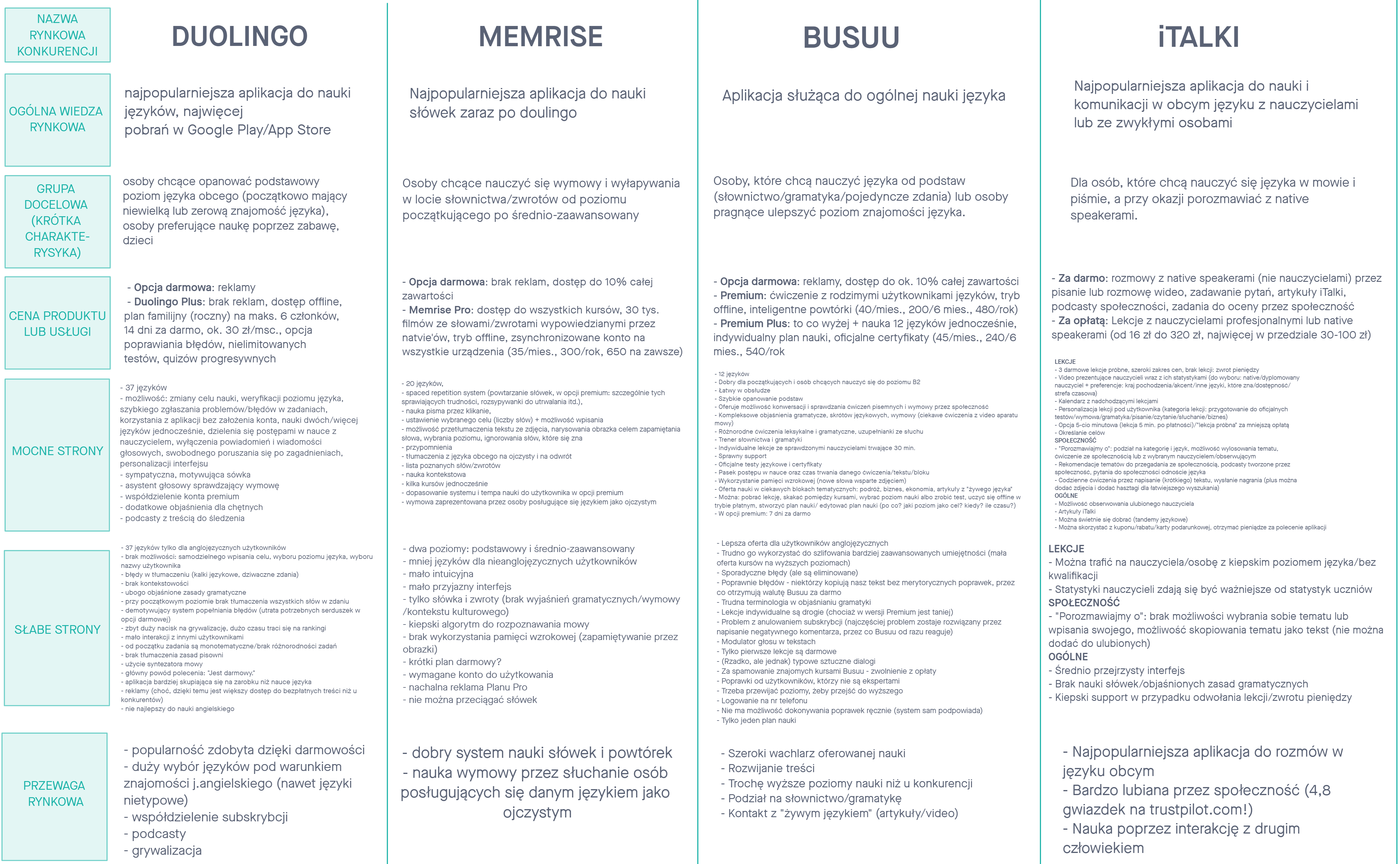Wszystkie produkty porównaliśmy według kilku kryteriów. Benchmarking pokazał nam jak rynek rozwiązuje problemy podobne do naszego. Sprawdziliśmy, co działa i jak działa. W ten sposób zrozumieliśmy, co możemy poprawić.