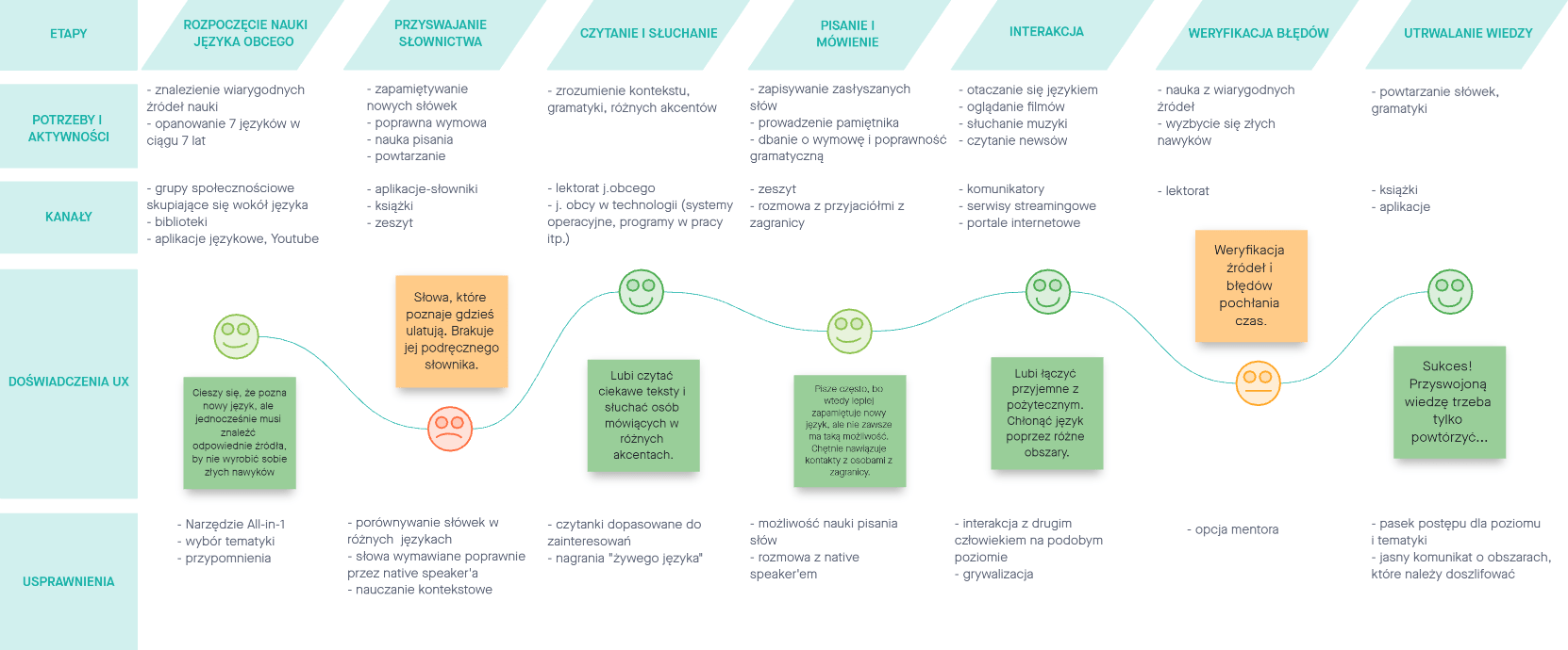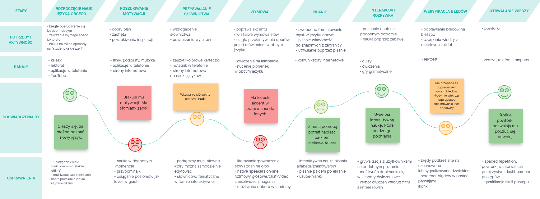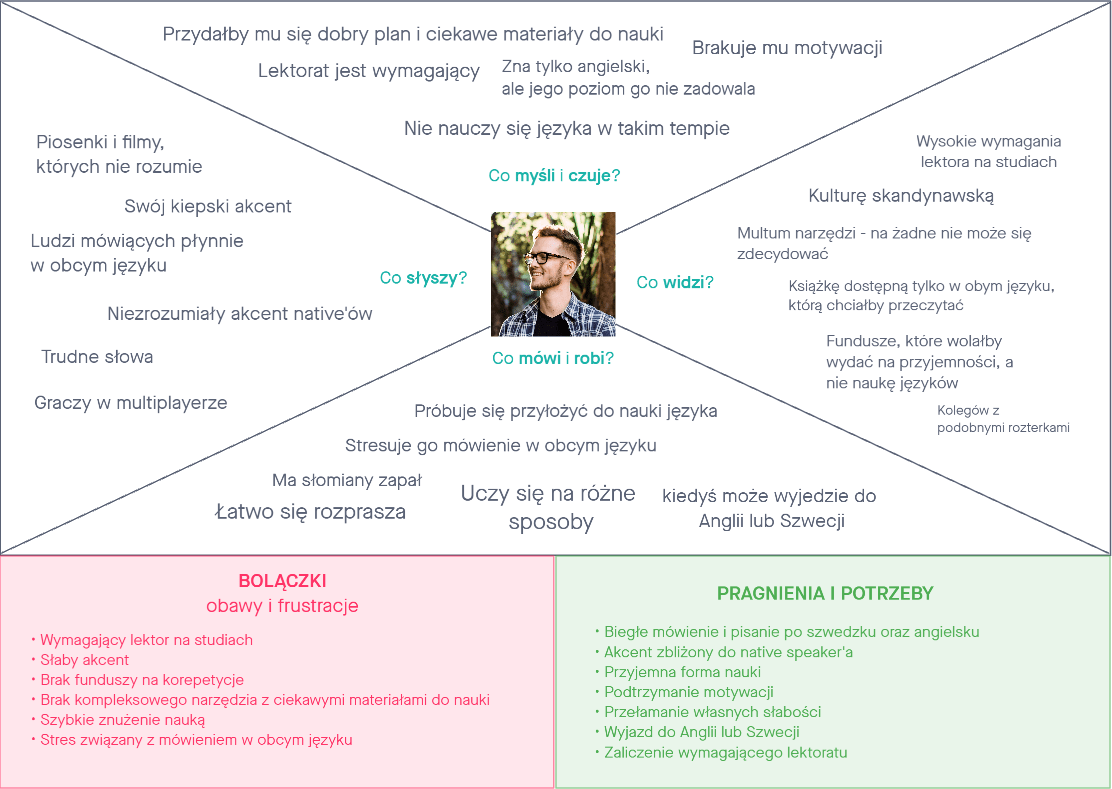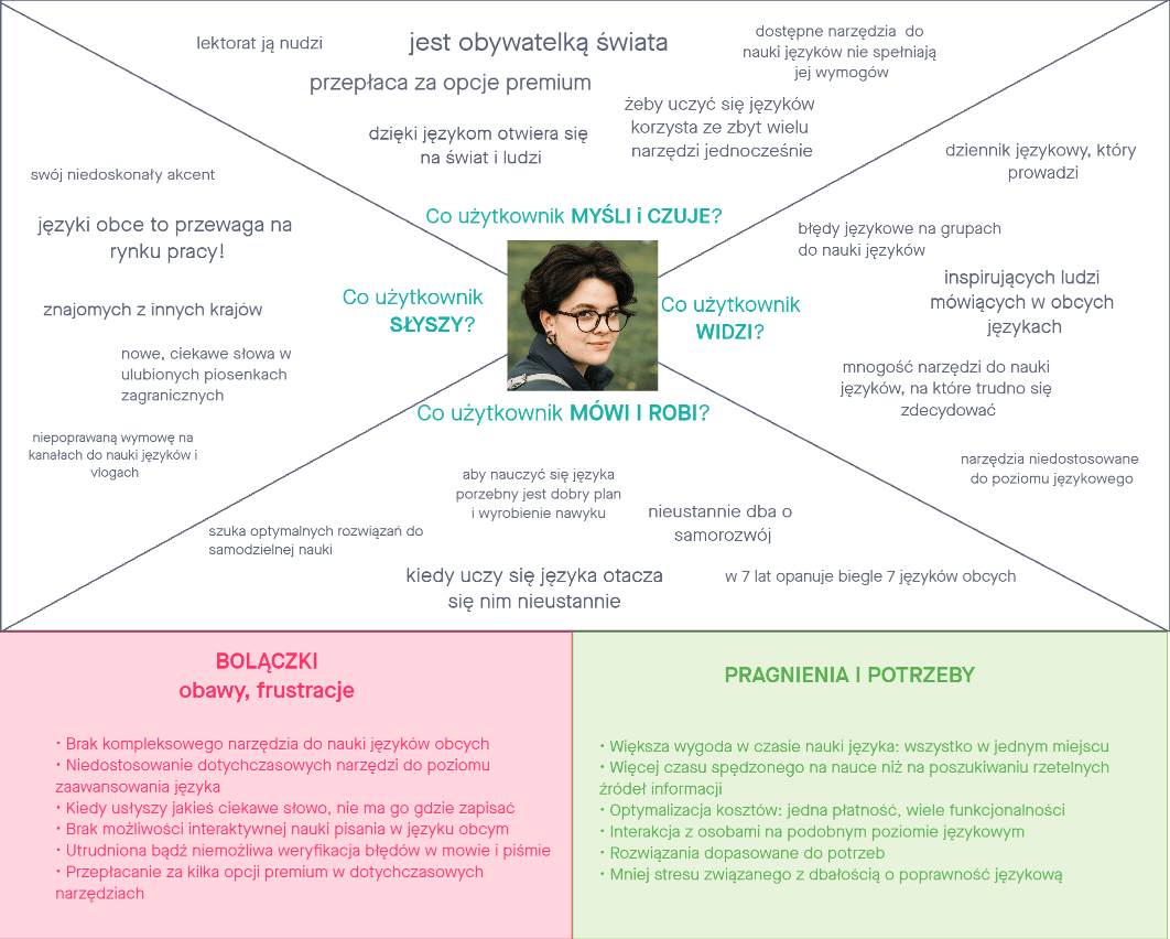 Zebrane dane pozwoliły nam także stworzyć mapy empatii. Podczas ich tworzenia wcieliliśmy się w rolę użytkownika, aby zrozumieć jego emocje, problemy, obawy, uczucia, potrzeby i działania, jakie podejmuje. Pomimo optymizmu i satysfakcji z nauki i progresów z nim związanych użytkownikowi towarzyszą napięcie i nerwowość. Zdefiniowanie emocji negatywnych i pozytywnych pozwoliło zidentyfikować punkty styku użytkownika z produktem. Zrozumieliśmy problem i rozpoznaliśmy potrzeby, tworząc listę korzyści, jakie nasz produkt mógłby przenieść na użytkownika.
