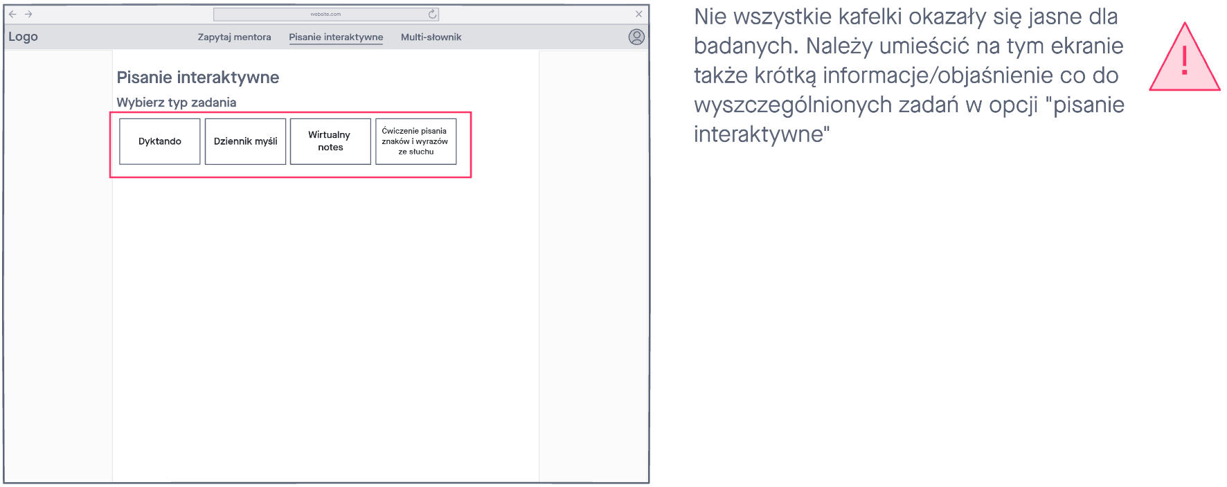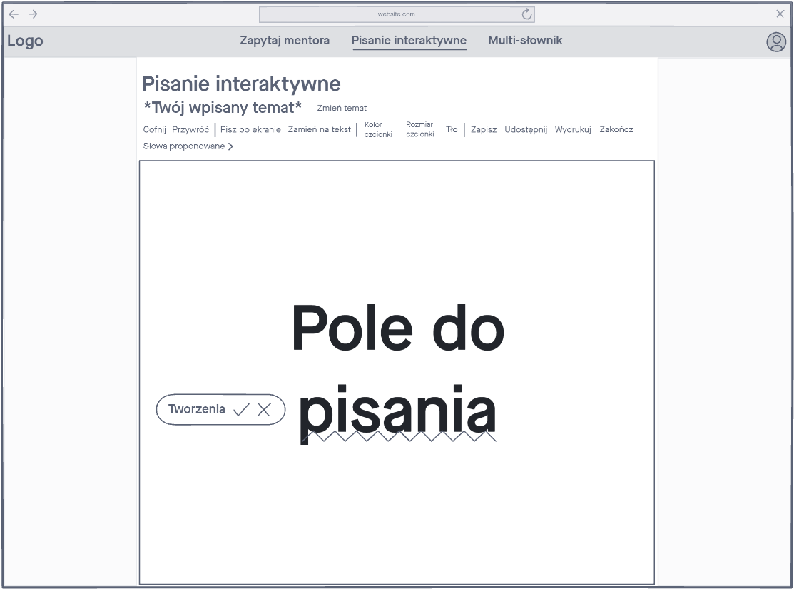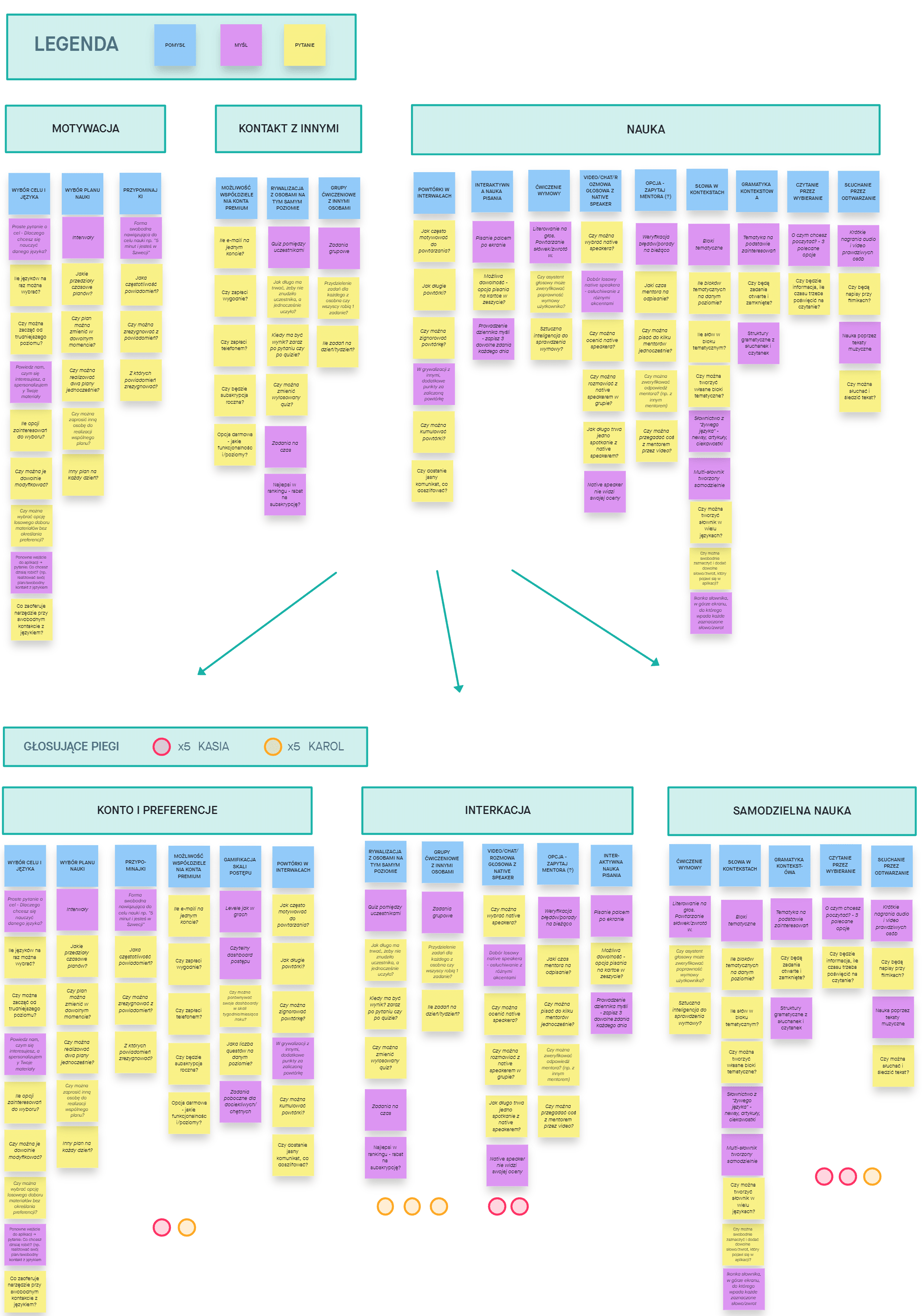 Zorganizowaliśmy „sesję burzy mózgów”, dokumentując wszystkie pytania, pomysły i myśli. Następnie głosowaliśmy nad tymi, które wydawały się najbardziej istotne dla dalszego rozwoju produktu. Z drugiej tury głosowania wyłoniła się lista niezbędnych funkcji. W ten spsobób wyłoniliśmy core naszego produktu, czyli: lekcje z mentorem, interaktywna nauka pisania znaków oraz słownik do którego można dodać własna nauczone słówka.