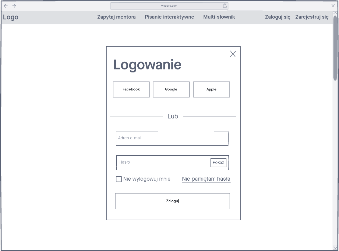 Pierwsze makiety wykonaliśmy na niskim poziomi szczegółowości, aby skupić się na zasadności naszego rozwiązania. Na tym etapie wciąż mieliśmy w głowie scenariusz, w jaki sposób nasze osoby będą korzystać z produktu. Mając na uwadze zaplanowane testy prototypów, dodaliśmy interakcje.