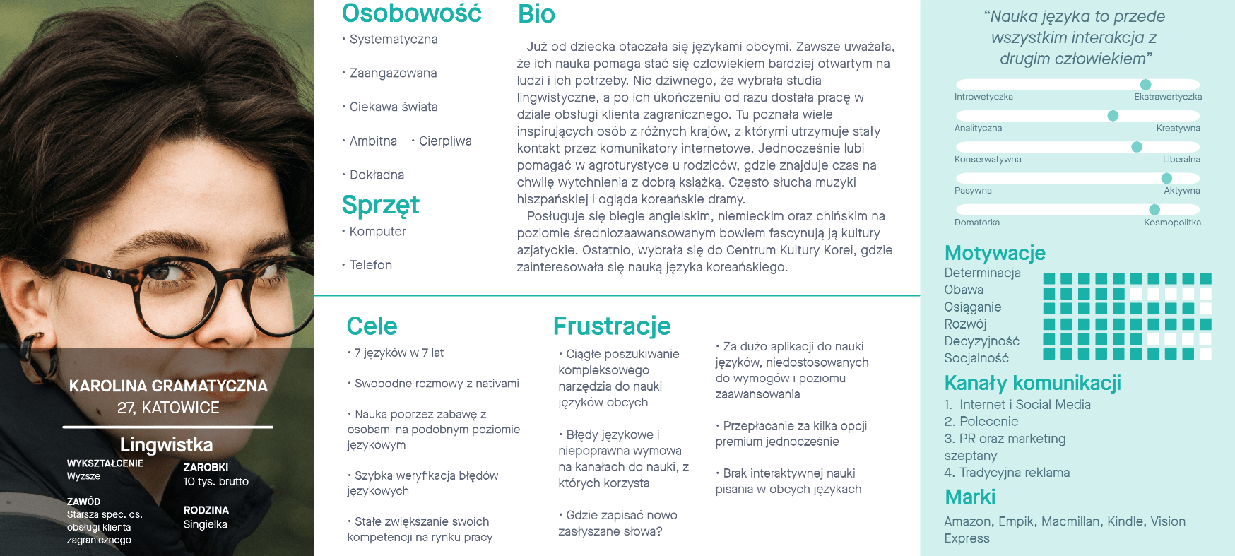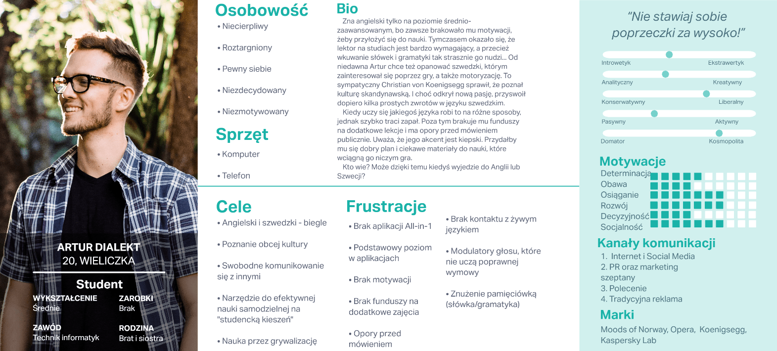 Z badań wyłoniły się nam dwie persony. Artur jest młodym studentem. Brak zarobków, motywacji oraz jego koszmarny angielski to chyba jego największe zmory w kontynuowaniu nauki języka. Karolina jest jego przeciwnym biegunem. Jest ambitna i fascynuje się kulturą azjatycką. Brakuje jej jednak kompleksowego narzędzia.