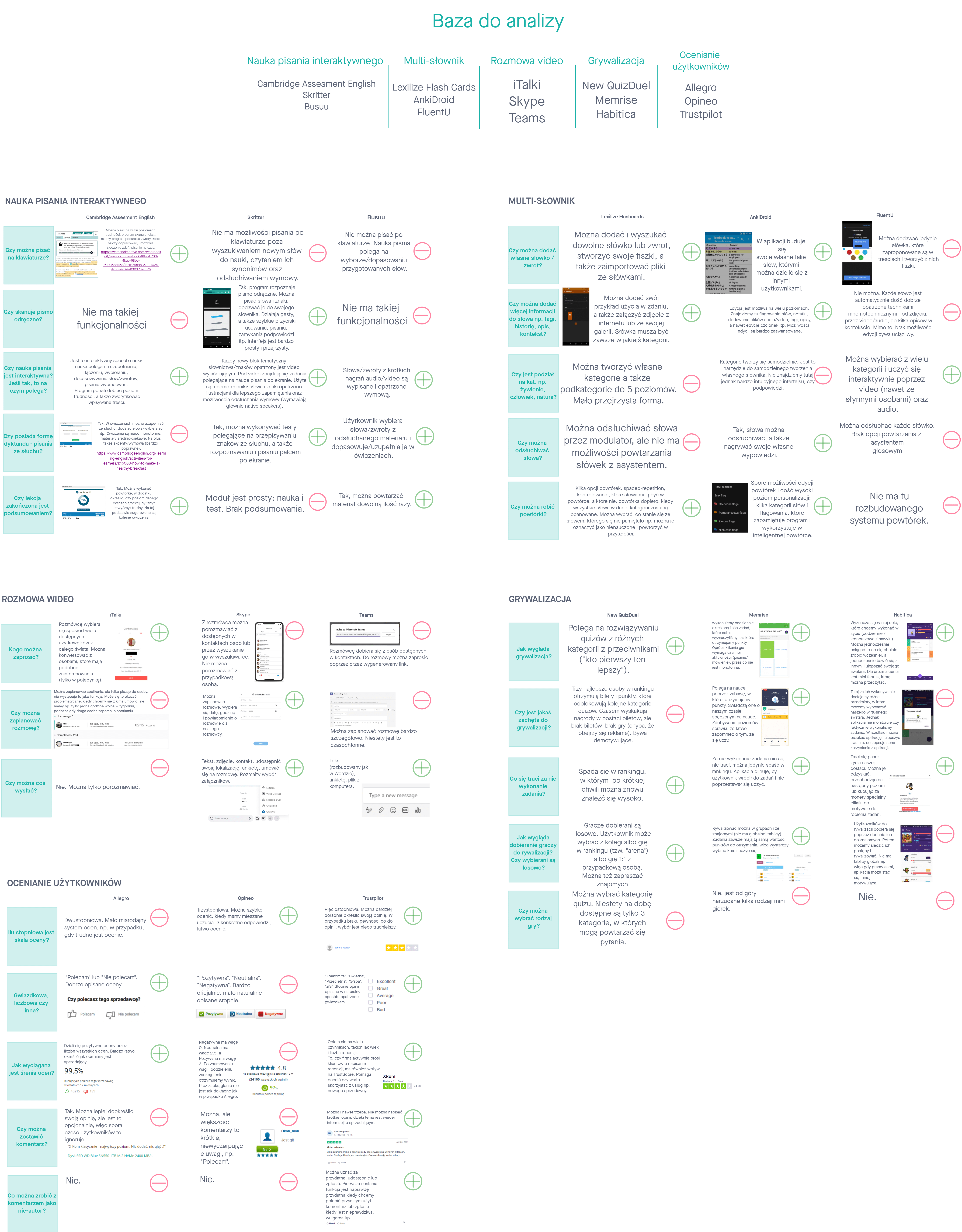 Po poznaniu naszych przyszłych użytkowników i ich potrzeb oraz poznaniu rynku, przyda pora na dookreślanie zaplanowanych unikalnych funkcji. Zbudowaliśmy bazę do analizy, gdzie na każdą funkcję przypadały po trzy przykłady z rynku. Każdą funkcję badaliśmy empirycznie według założonego scenariusza walidacyjnego.