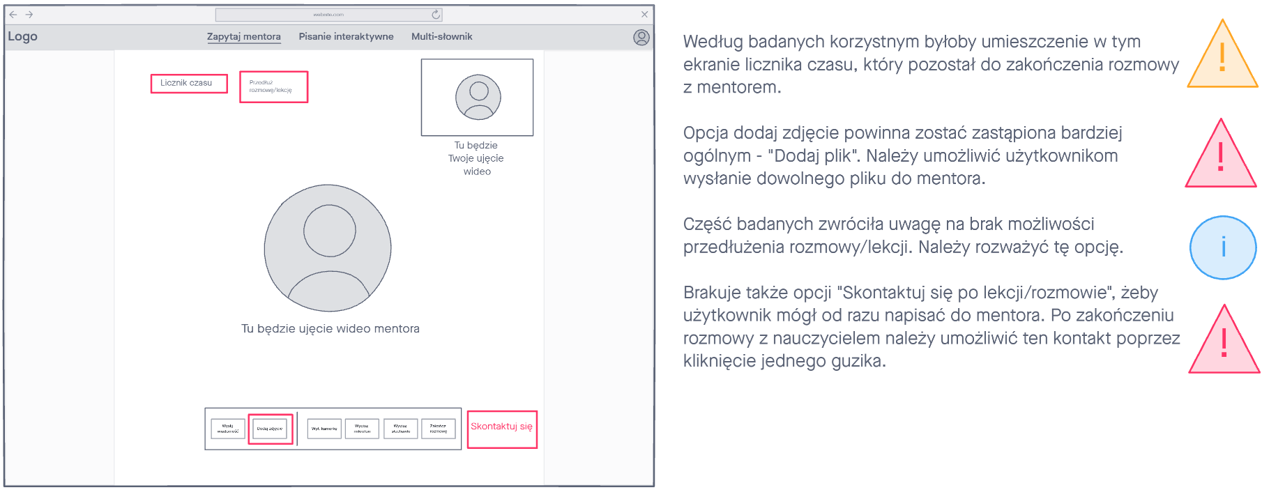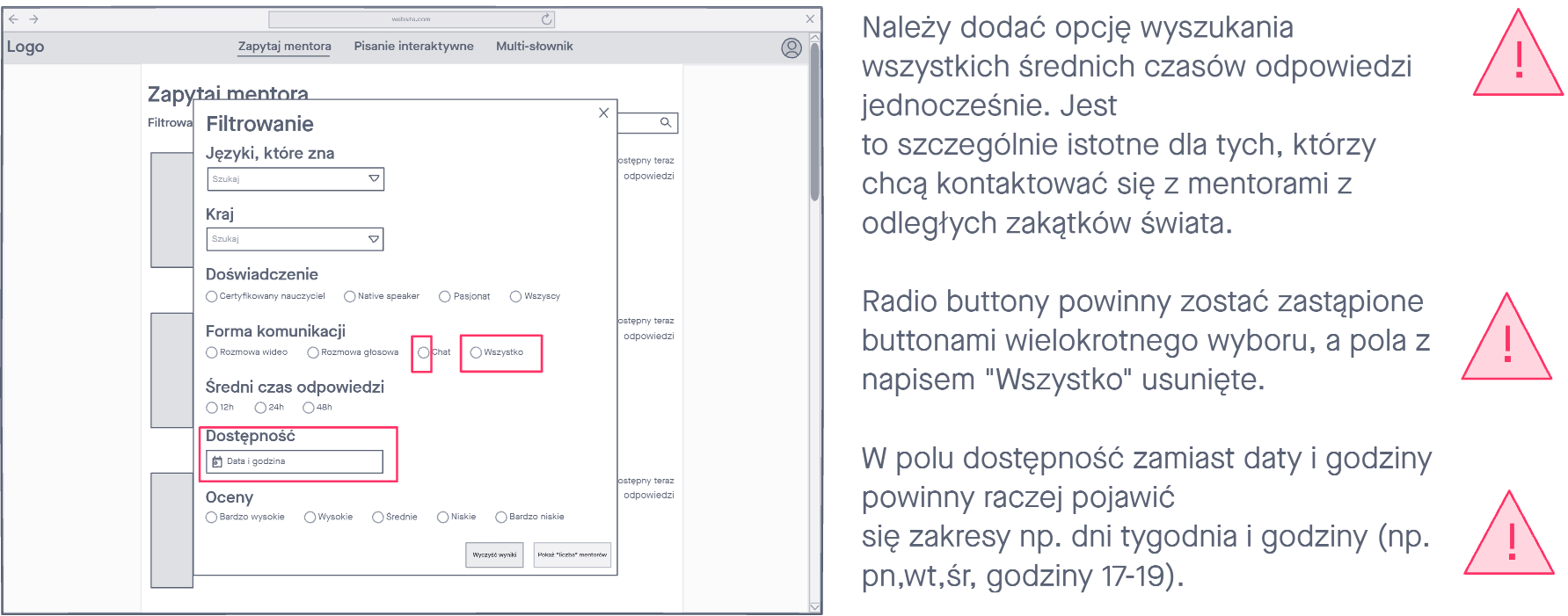 Podczas testów przeprowadzonych według scenariusza testowego zaobserwowaliśmy, że użytkownicy mieli kilka uwag odnośnie prototypu m. in. brak jasnego opisu funkcji w pisaniu interaktywnym, trudności w wyborze dostępności mentora przy filtrowaniu czy nomenklatury. Następnie został sporządzony raport. Zawarty w nim został opis problematycznych sytuacji z testu Lo-fi oraz rozwiązania, które zostały wdrożone na makietach Hi-fi. Następnie testy zostały powtórzone.