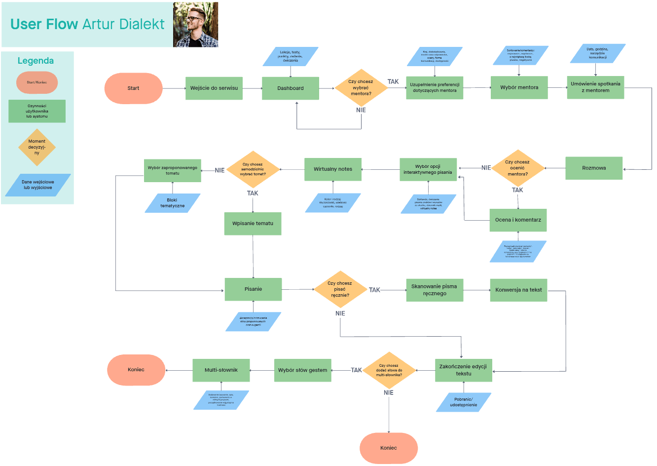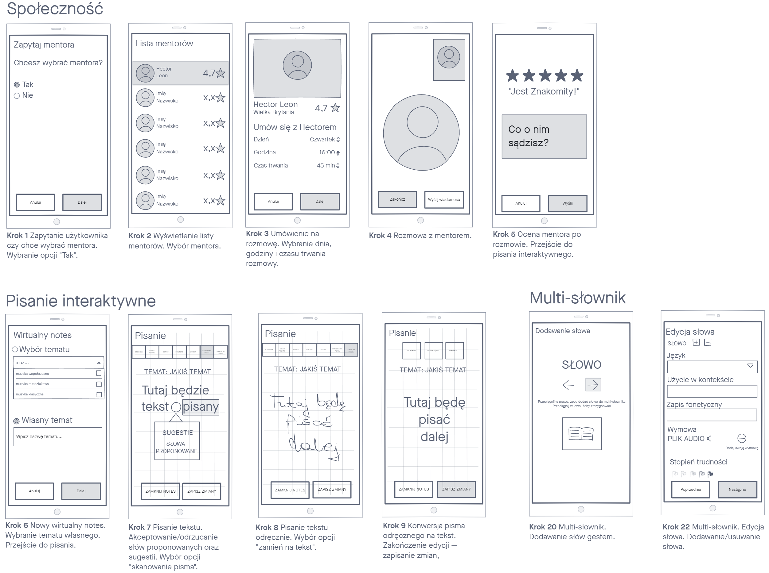 User Flow przedstawia sposób w jaki użytkownik umawia się z mentorem na lekcję, pisze słówka ręcznie, po czym dodaje je do słownika.