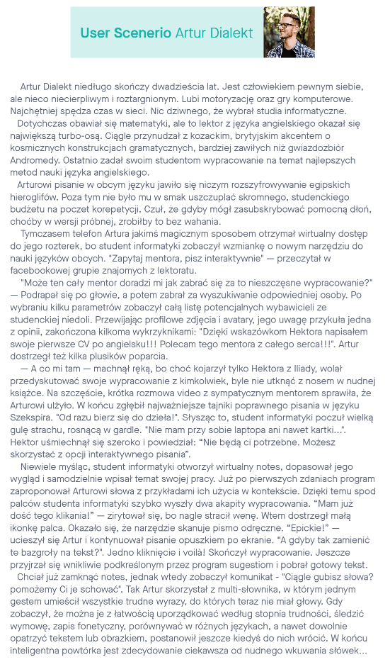 Scenariusz użytkownika oddał nam perspektywę i logikę tego jak użytkownik będzie korzystał z naszego produktu oraz przedstawił nam motywacje i kolejne kroki działania.