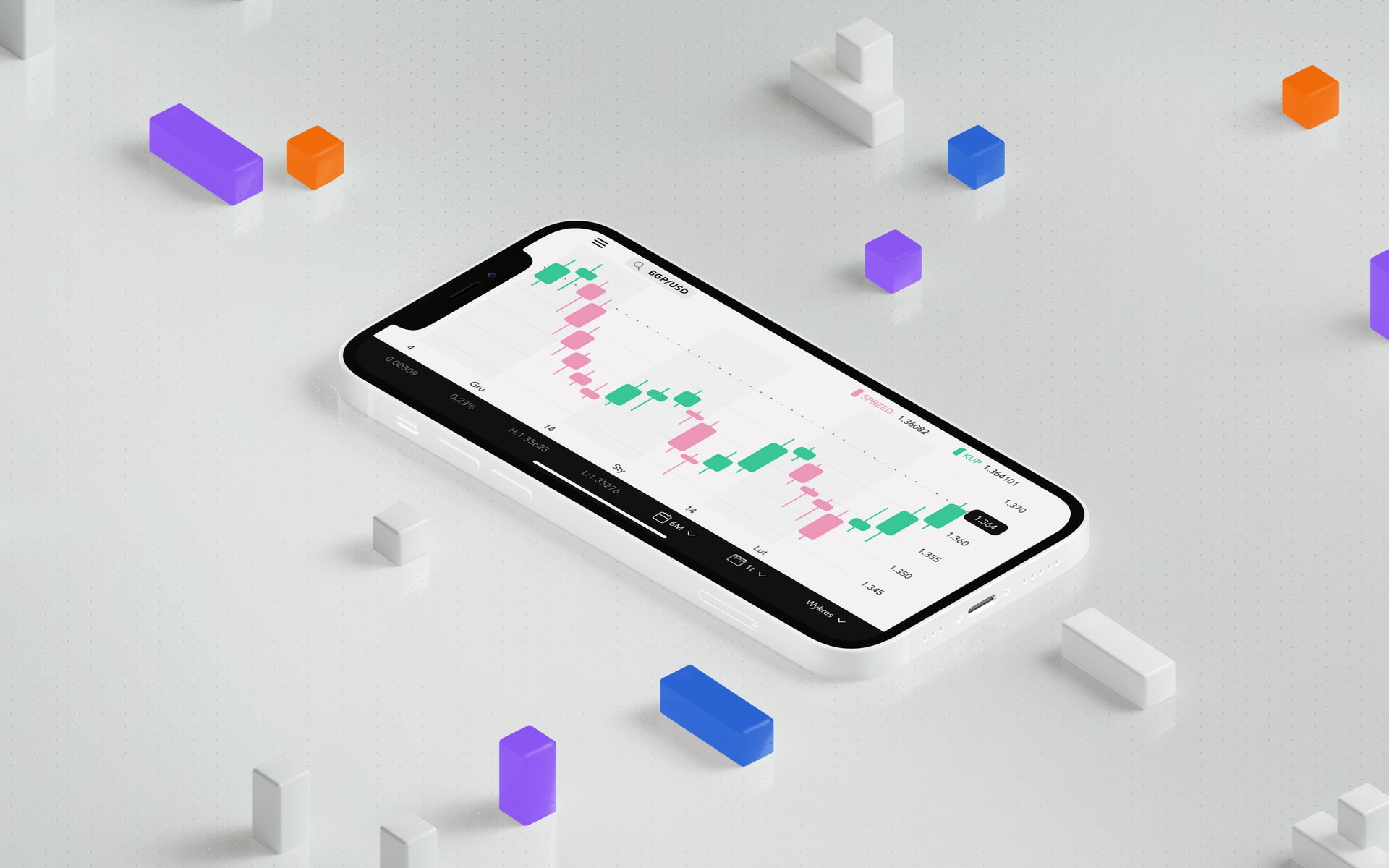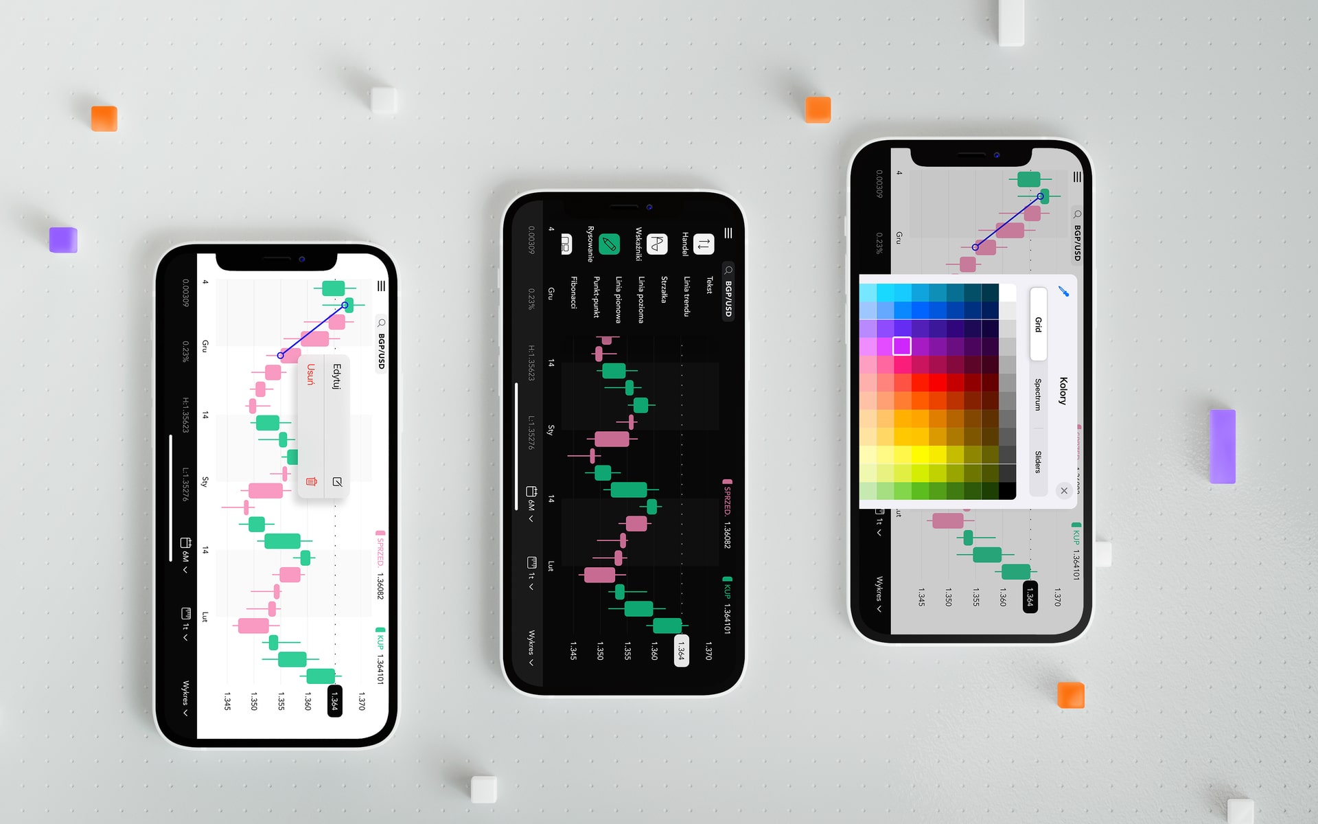 Aplikacja powinna zawsze wykazywać się łatwością i szybkością, a jednocześnie być niekonwencjonalna. Wygląd i styl marki jest swobodny i ekscentryczny. Zdecydowałem się zaprojektować rozwiązanie w trybie Landscape, gdyż dla użytkowników ważny jest przedział czasowy i analiza, jak zachowywał się dany kurs.