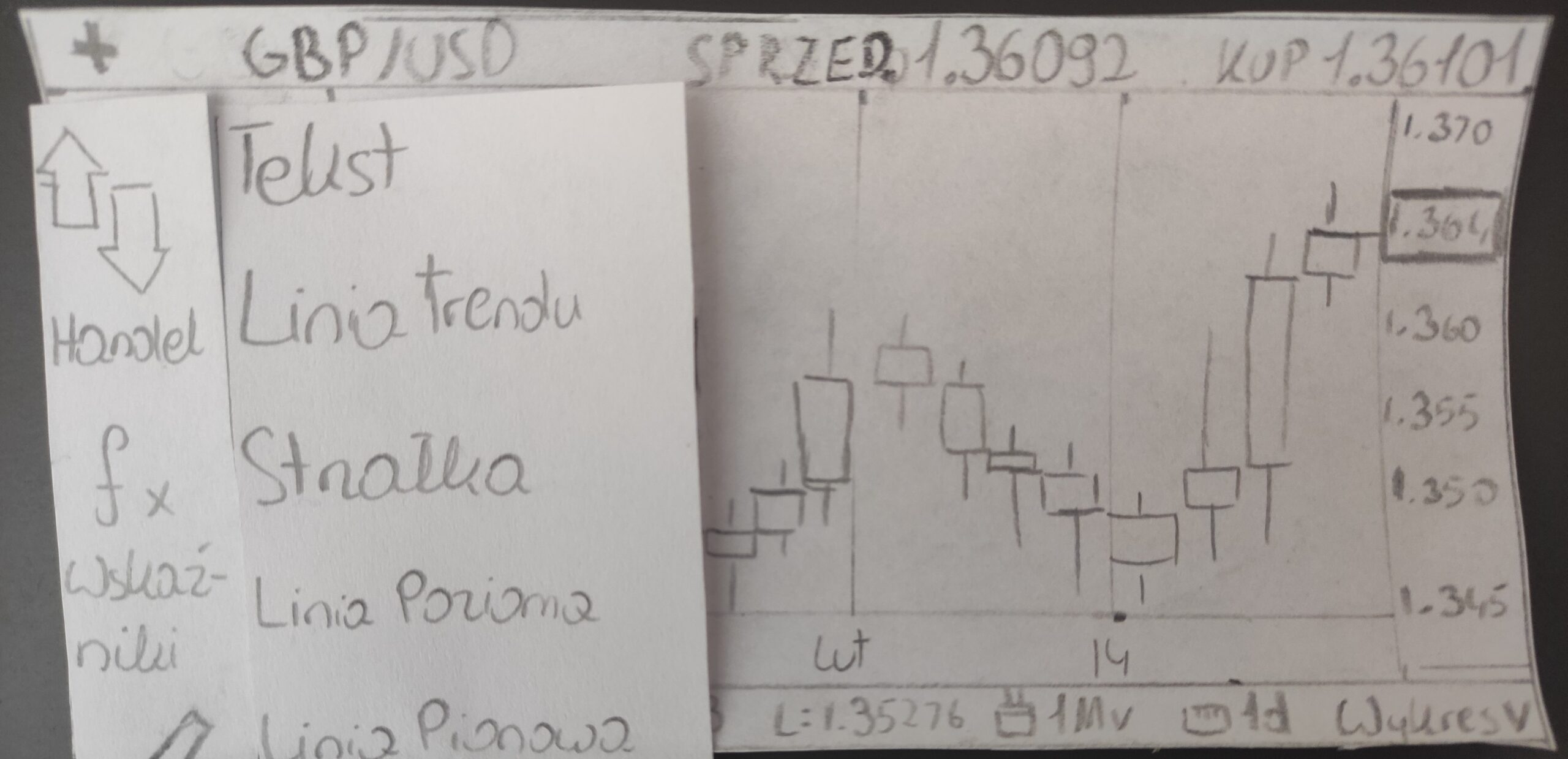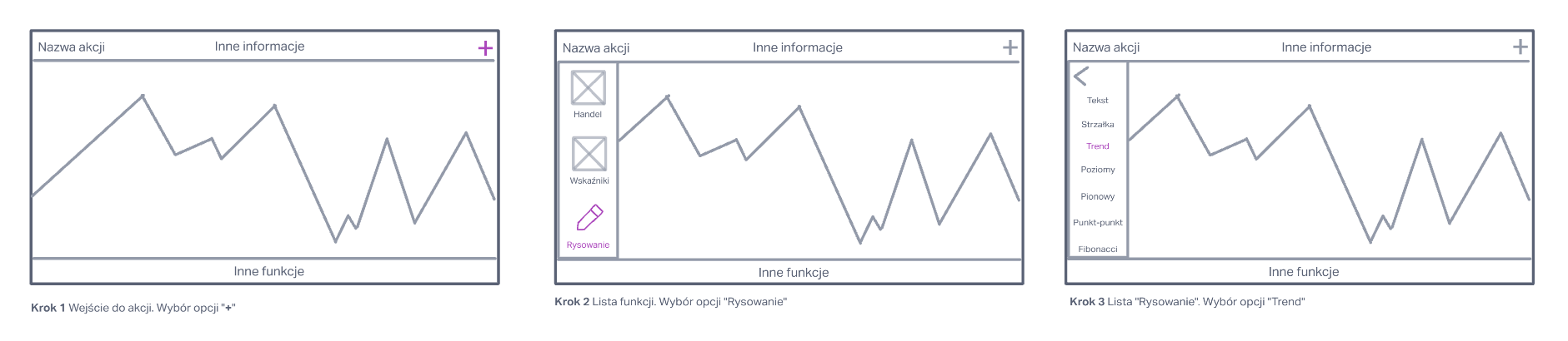 Stworzyłem wireflows, by zaprezentować jak użytkownik będzie dochodził do menu z narzędziami rysowania i wyboru funkcji linii trendu.