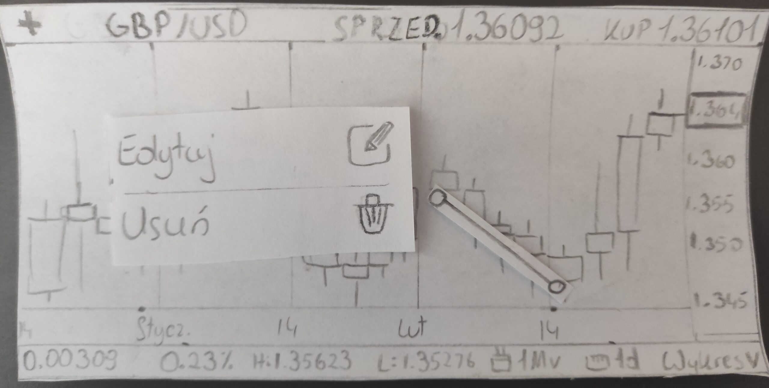 W kolejnym kroku przygotowałem prototyp papierowy i przetestowałem go z badanymi. Mieli za zadanie dodać linię trendu, wyznaczyć by przechodziła przez dwa punkty oraz ją edytować. Badani borykali się z problemem dodania linii, jednak po dokładniejszym wyjaśnieniu pytania bez trudu przechodzili przez kolejne etapy zadań.